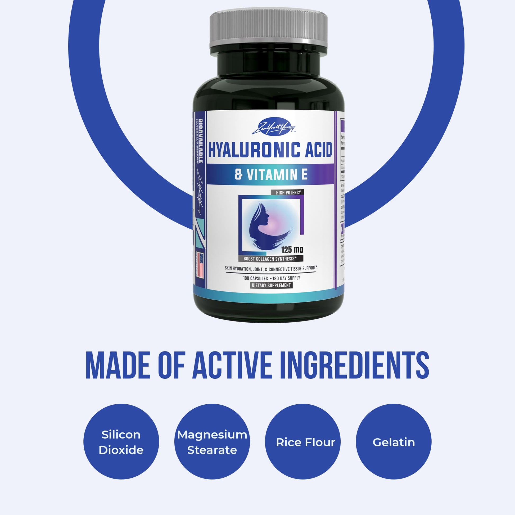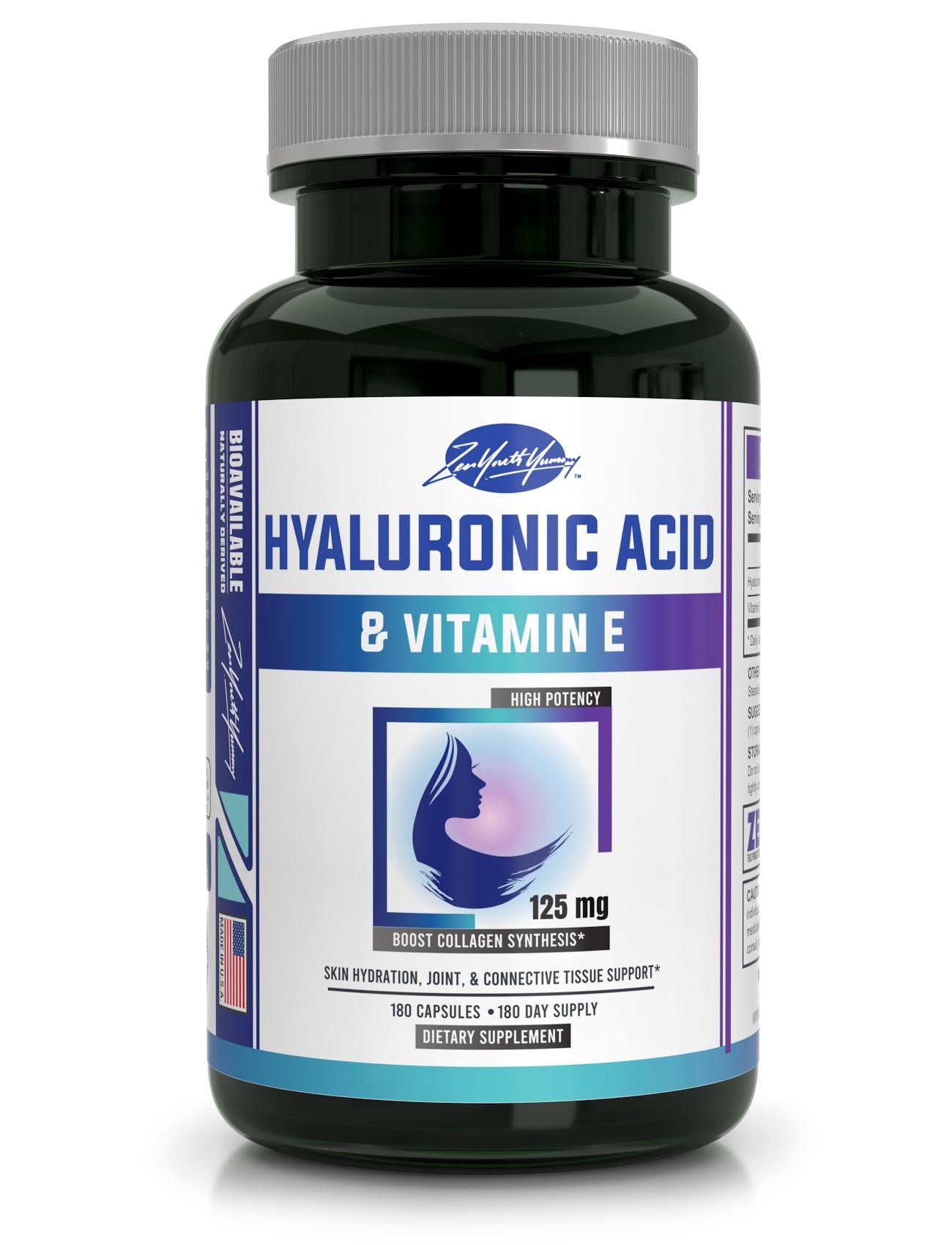 ZYY Hyaluronic Acid&Vitamin E Boost Collagen Synthesis 125mg Skin Hydration,joint& Connective Tissue Support 180 Capsules 180Day Supply by ZYY NUTRITION is a potent wellness supplement designed to enhance your overall well-being.